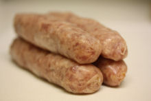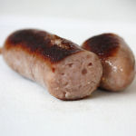 P Hollingsworth (Chelmondiston) - PorkQuite a smooth textured sausage, with a medium bite. They cooked up well and although the skins did look very fine (and a bit baggy in the raw) they browned and tightened nicely without any splitting. Minimal shrinkage/weight loss and although not a strongly flavoured sausage, one with a very agreeable taste.